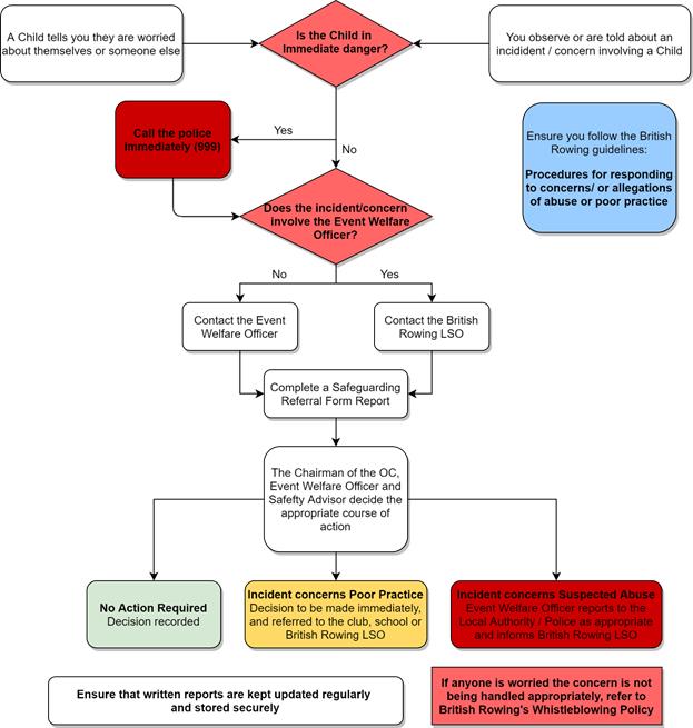 - Ensure robust safeguarding arrangements and procedures are in operation – a designated Event Welfare Officer will be appointed annually and is responsible for receiving and managing any concern/reports with the appropriate bodies (British Rowing, Local Authorities, the NSPCC and/or the Police).